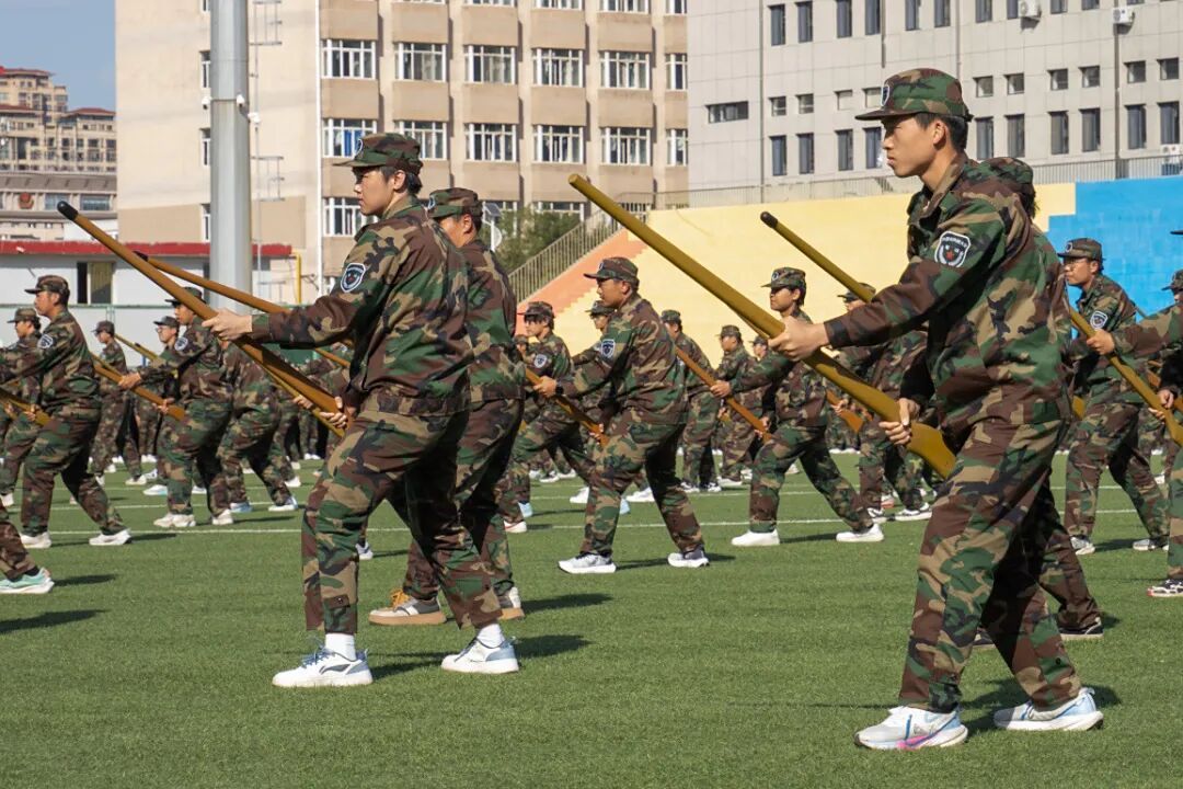 参训学生进行了拳术、刺杀操、匕首操等军事科目汇报,展现出科大学子积极向上、奋发拼搏的精神风貌。拳术方队以《男儿当自强》的旋律节奏与精神内涵为基调,将拳术动作、队列变换与音乐节点完美契合。刺杀操方队以刚猛姿态震撼亮相,不仅展示了动作与战术,更生动诠释了“自强不息敢为人先”的科大校风。匕首操方队整齐列队、精神抖擞,每一个动作都刚劲有力、精准到位,连贯的招式将匕首操的攻防要义展现得淋漓尽致。随后进行队列会操,伴随着雄壮的《分列式进行曲》,63个连队正步走过主席台,铿锵有力的步伐踏出钢铁意志,响彻云霄的口号喊出铮铮誓言。