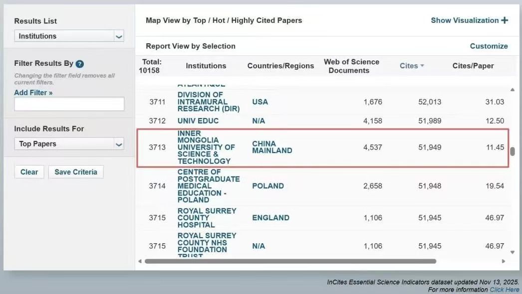 内蒙古科技大学化学学科ESI全球排名进入1%