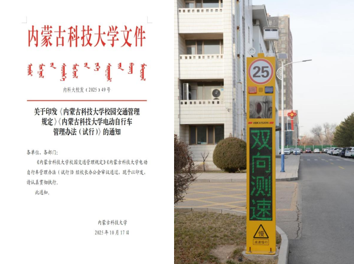 2025年10月,完成校园道路测速预警一体化管理系统和校园电动自行车管理系统建设,安装9个智能测速一体机和5个智慧曝光平台,制定出台了《内蒙古科技大学校园交通管理规定》《内蒙古科技大学电动自行车管理办法》,实现人员、车辆信息管理、身份验证、远程预约、测速预警,进一步提升校园秩序精细化管理水平。成为校园交通管理创新案例。