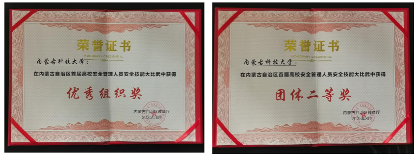 安全队伍专业化建设成效显著。通过“引进来+走出去”的培养模式,五年间累计组织安全管理培训50余场次,覆盖人员1200余人次,推动构建“专业+兼职”的安全管理人才梯队。先后荣获自治区荣誉3项、包头市荣誉3项,2024年4月,在中共包头市委国安办、包头市国家安全局主办的“国家青年安全说”宣讲比赛活动中教师组第二名、学生组第二名的好成绩,学校获得“最佳组织奖”。2025年8月,在全区首届高校安全管理人员安全技能大比武中,荣获团体二等奖,参赛保卫干部获得“消防技能能手”荣誉,学校获优秀组织奖。