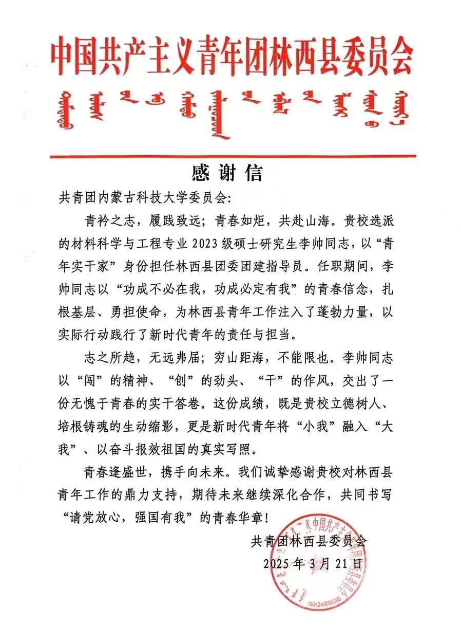校地企联动不断深化,与昆区团委、包九中等单位建立合作关系,选派15名学生兼任街镇团(工)委副书记,捐赠图书角、开展共建活动20余次;积极参与西部计划,五年来累计输送31名学生赴西部基层服务,为乡村振兴贡献青春力量。